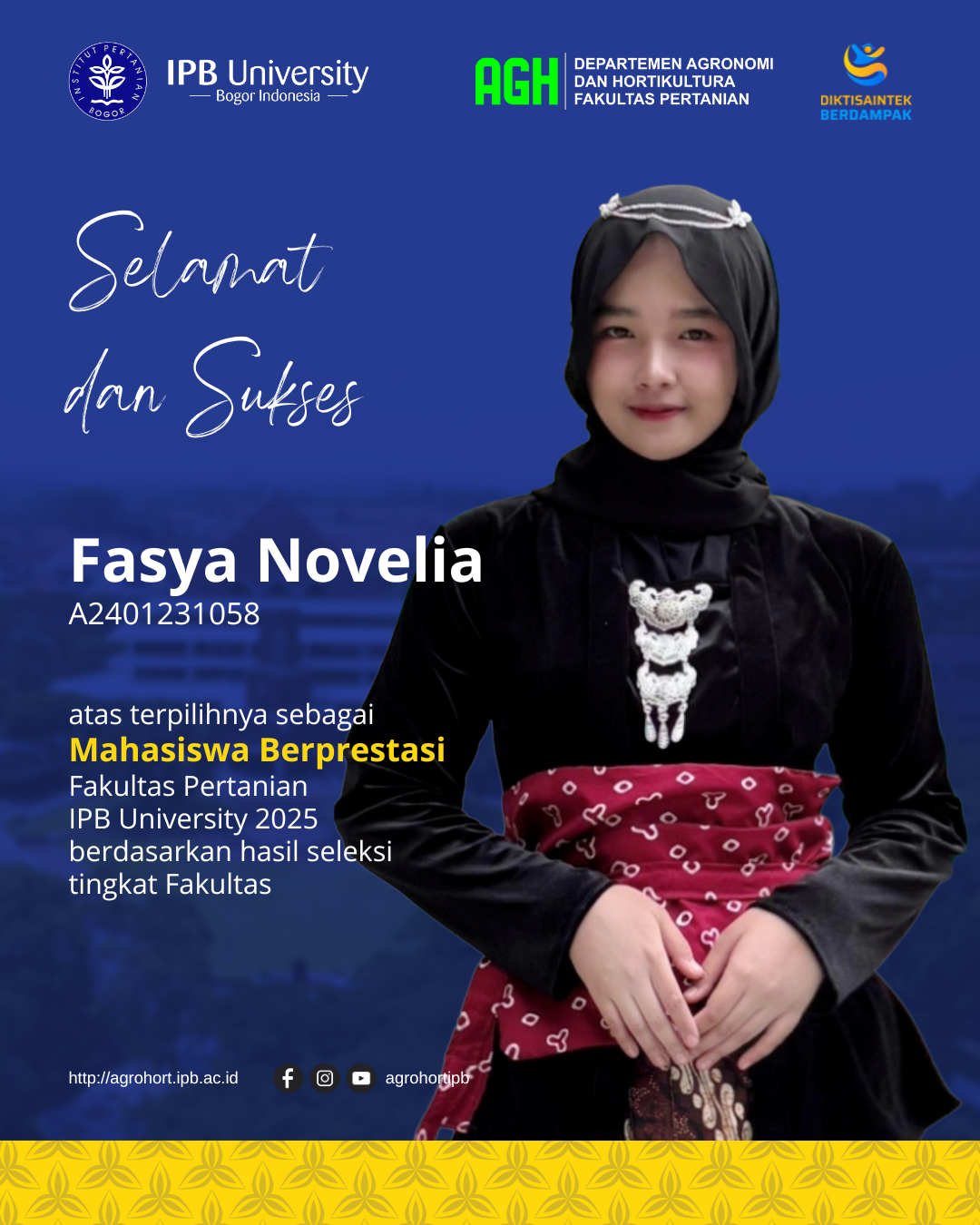 “Menjadi bagian dari keluarga besar Agronomi dan Hortikultura IPB membuka mata saya bahwa pertanian adalah jantung kehidupan dunia. Di sini, saya belajar dari para pakar dan pemulia tanaman terbaik di Indonesia. Fasilitas laboratorium yang lengkap dan jejaring alumni yang luas sangat membantu saya dalam mengembangkan riset tentang ketahanan pangan nasional. AGH bukan sekadar tempat belajar tentang tanaman, tapi tempat menempa mentalitas untuk terus berinovasi demi kesejahteraan petani dan kedaulatan pangan Indonesia.”